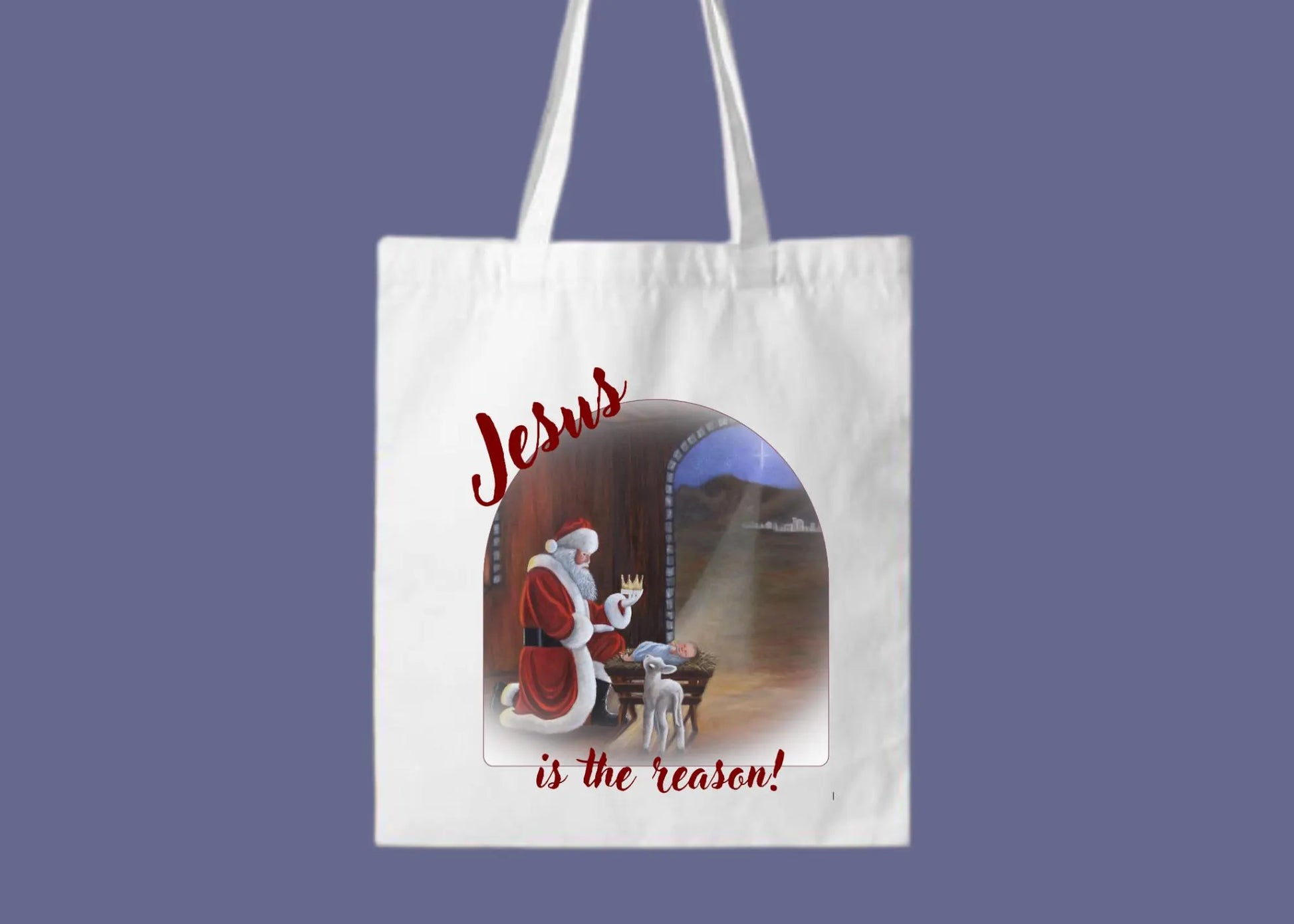 This beautiful and unique tote bag features a print of the original oil painting, "Glory Given", by artist Shelly Miller of Inspired Brushworks Art Studio. The scene features Old Saint Nick kneeling at the manger in a unique Nativity scene, presenting the newborn King with a gold crown. Who better than Santa himself to set the example of giving Jesus all the glory and to remind everyone that Jesus is the Reason for the Season? What a wonderful and unique, yet inexpensive, gift for a religious family member, church friend, or pastor's wife for Christmas or any occasion! This tote is priced just right for giving at a white elephant or Secret Santa gift exchange and just the right size to serve as a multifunctional carry-all which could be used as a reusable grocery shopping bag, a school bookbag, a bible study or church bag, a beach bag, etc. Would also make a great and unique Christmas stocking to hold all sorts of goodies!