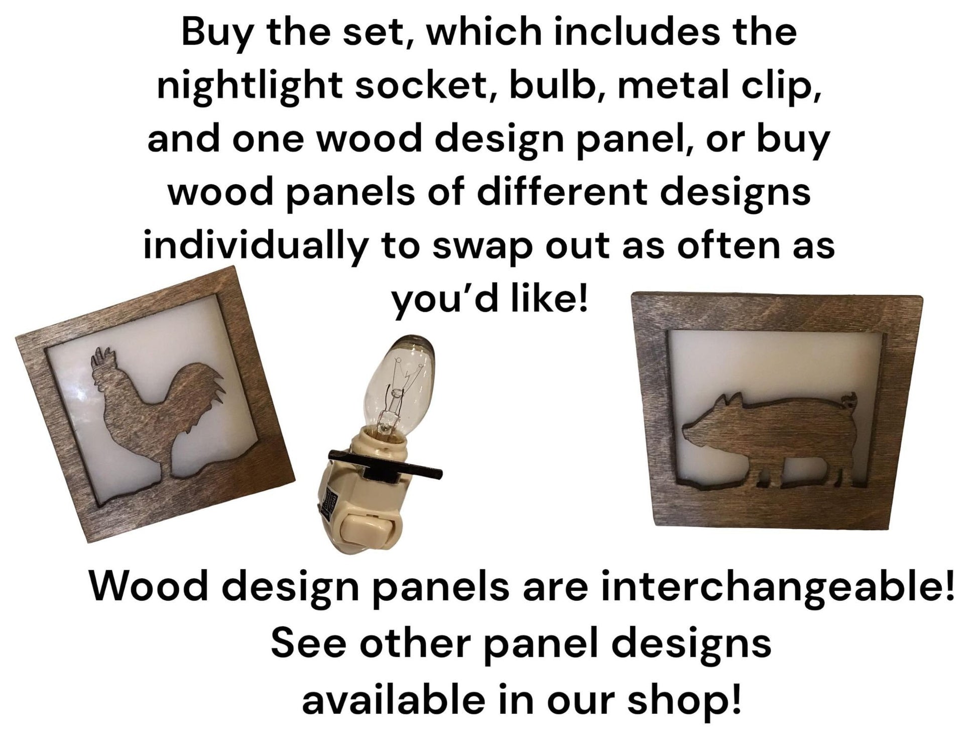 Purchase a complete set, which includes electric nightlight unit with 4W bulb and metal clip and the wood cover/shade with rooster design, or purchase the cover separately if you already have a night light unit with a metal clip and want some different designs that you can display. (Note: these wood covers will only work with a night light unit that includes the metal clip as shown in the listing photo.)