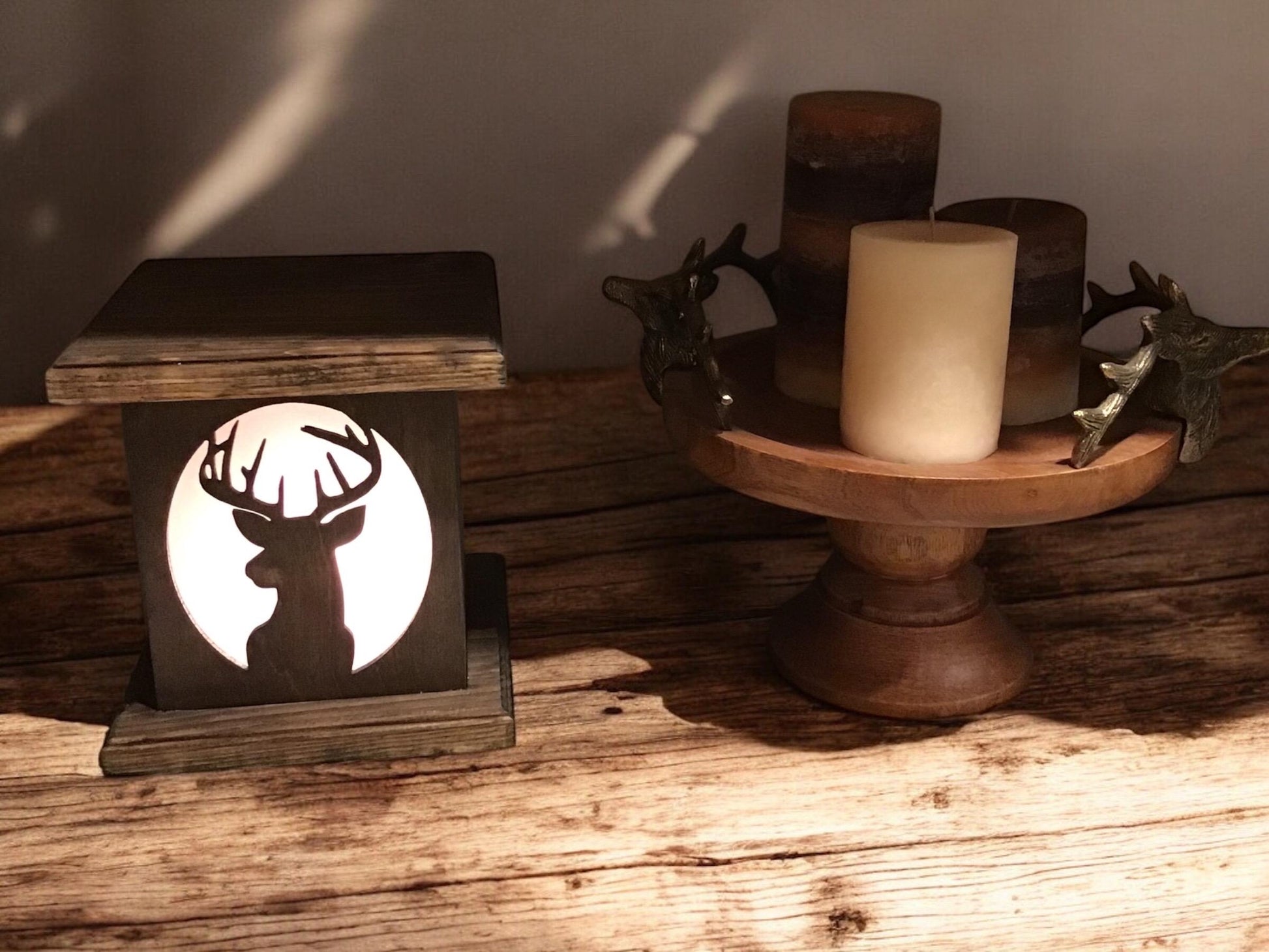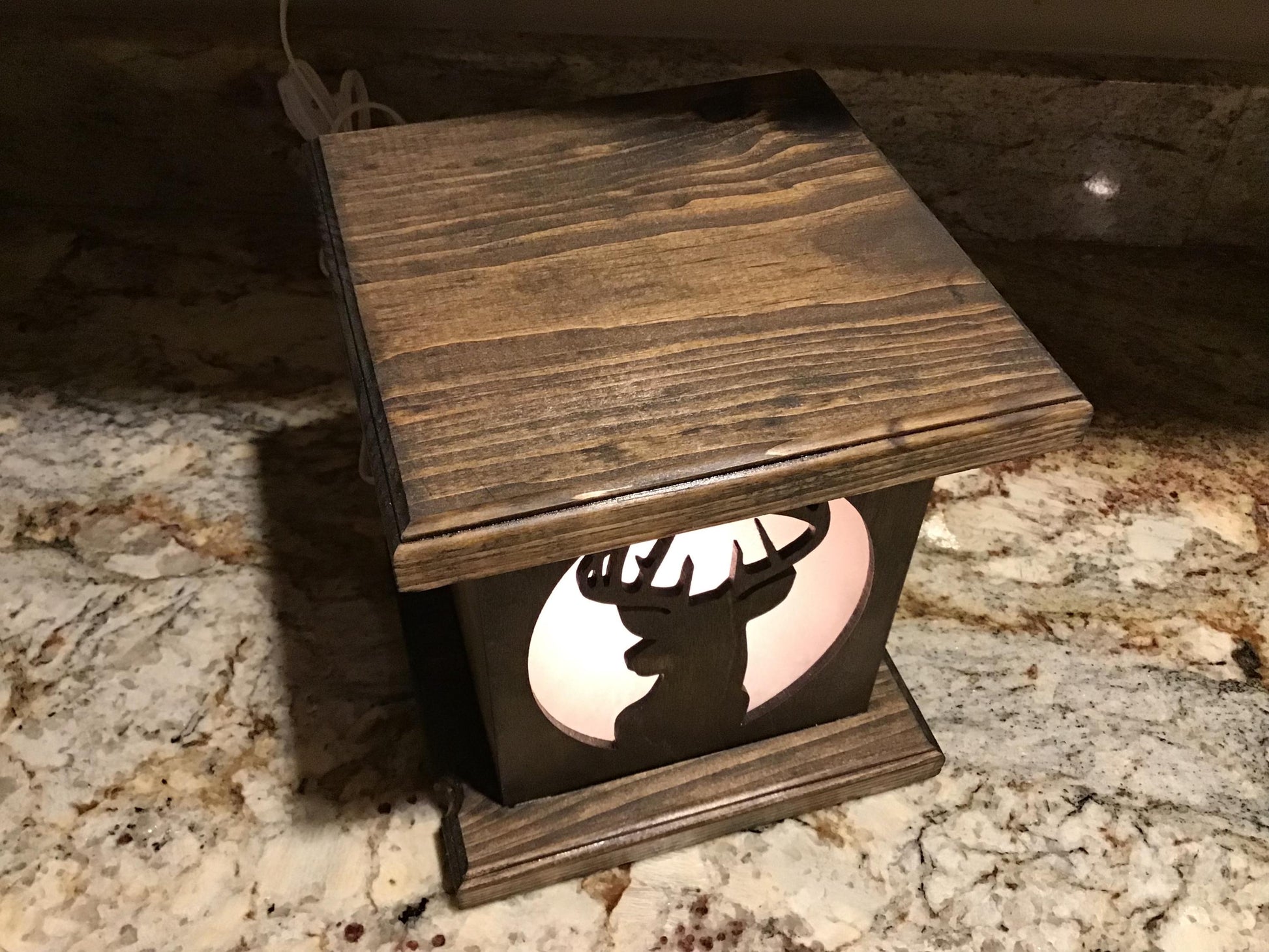 This beautiful and unique rustic wood nightlight, lantern or table lamp depicts a majestic buck whitetail deer showing off his awesome rack of antlers. This lamp would make a wonderful gift for the hard-to-buy-for hunter, outdoorsman, or wildlife lover in your life. What a great accent piece for a hunting cabin or home decorated in wildlife decor!