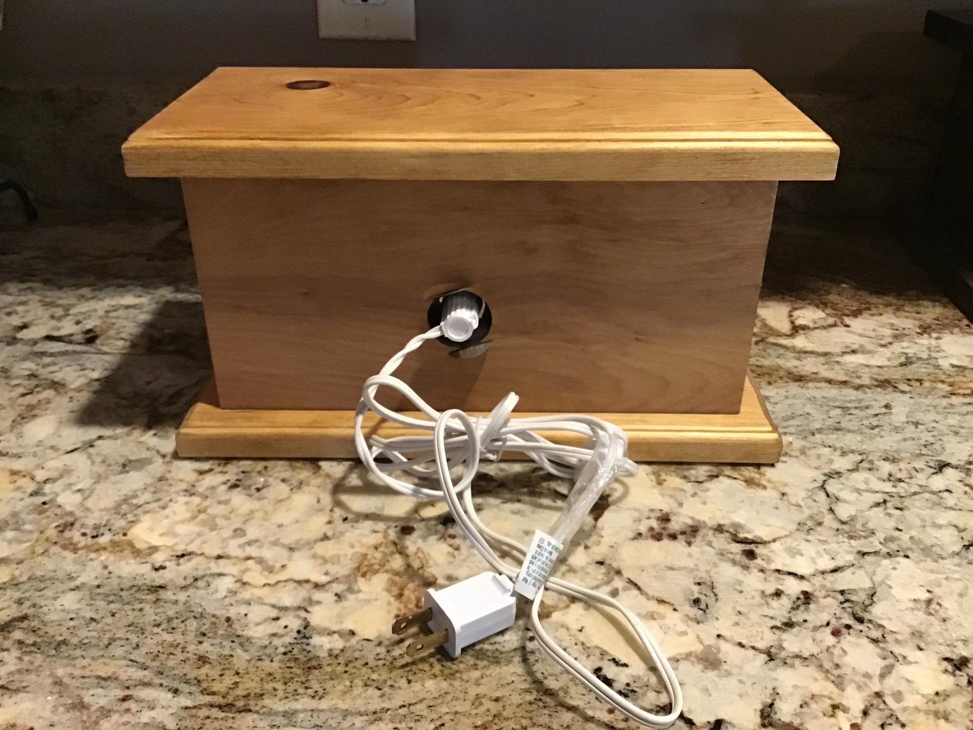 Top and bottom bases were crafted from solid pine and measure approximately 0.75-inch thick with a decorative edge profile. The lamp is available in your choice of golden oak or mahogany stain finish. Felt pads are attached to each corner of the bottom base to protect the lamp and the furniture it rests on from scratches. The lamp is powered by electricity and comes with a nightlight socket kit that plugs in to any wall outlet, featuring an on/off switch and white cord measuring approximately 6 feet in length. Nightlight bulb is rated at 5W. Bulb socket can easily be inserted and removed from the back panel of the lamp to allow for quick bulb replacement when necessary. One bulb and one extra fuse are included with your lamp.