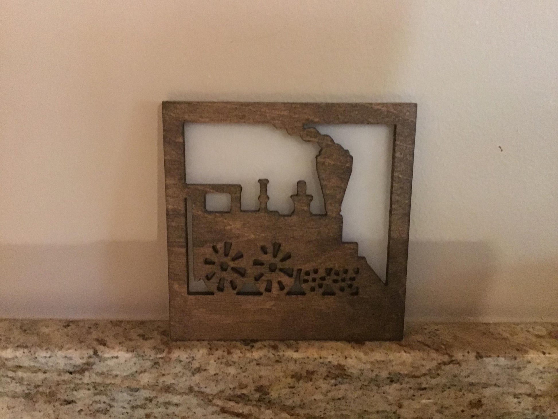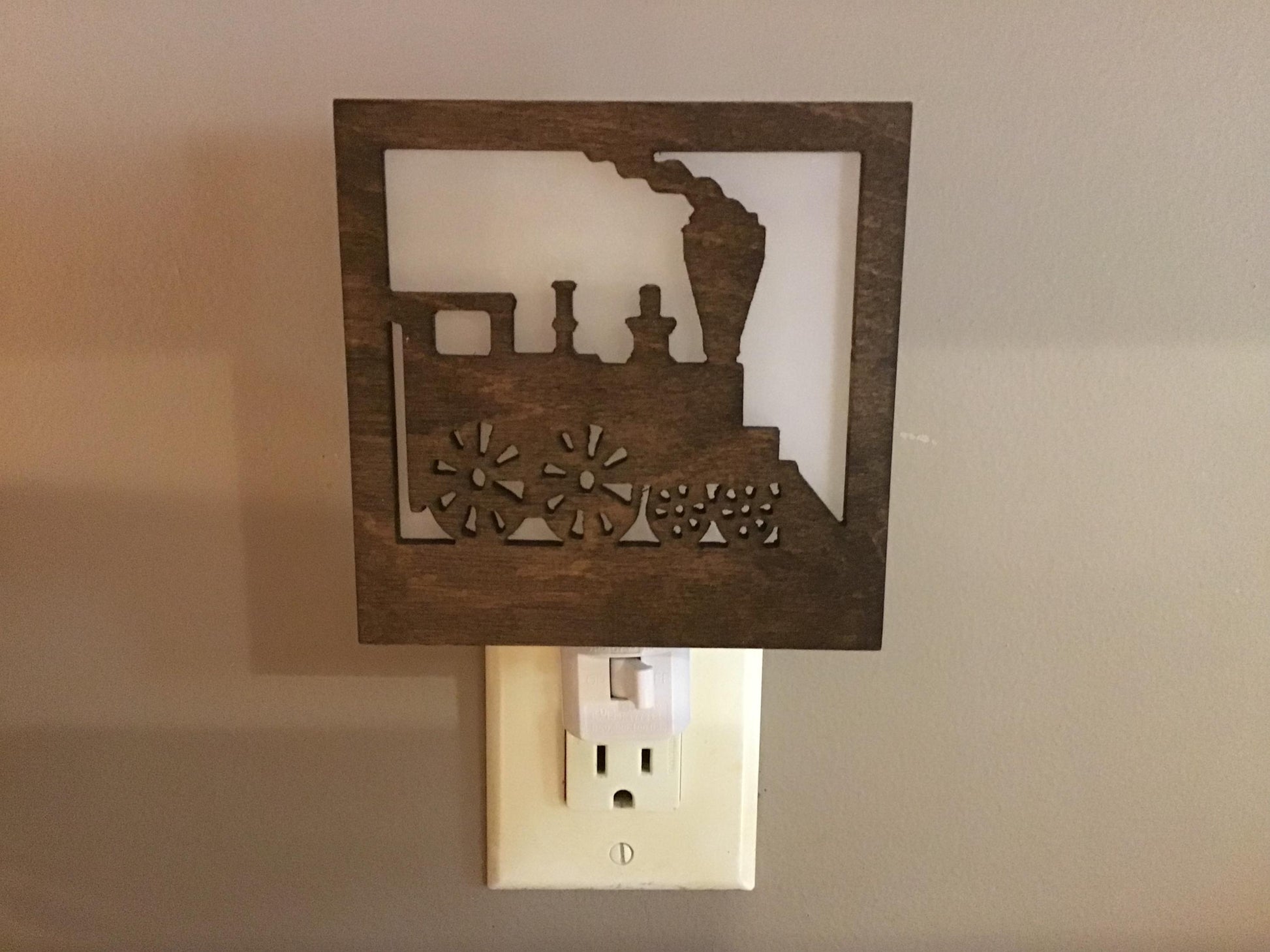 This interchangeable night light shade design features an old-time steam engine! What a perfect way to provide soft, ambient light in a rustic cabin or any room decorated in a train or locomotive theme. This would make a great gift for the lover of steam engines, trains, and locomotives or for someone who works or worked on the railroad.